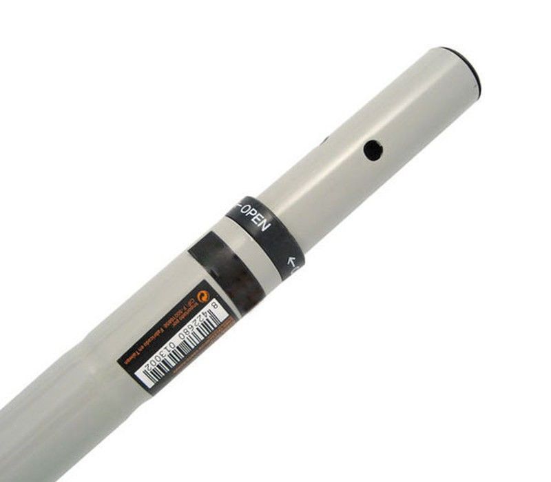 Mango telescópico de aluminio con acabado metálico plateadoEtiqueta negra con texto en blanco y código de barrasBotón negro para extensiónAnillo de goma negro con inscripción 'open'