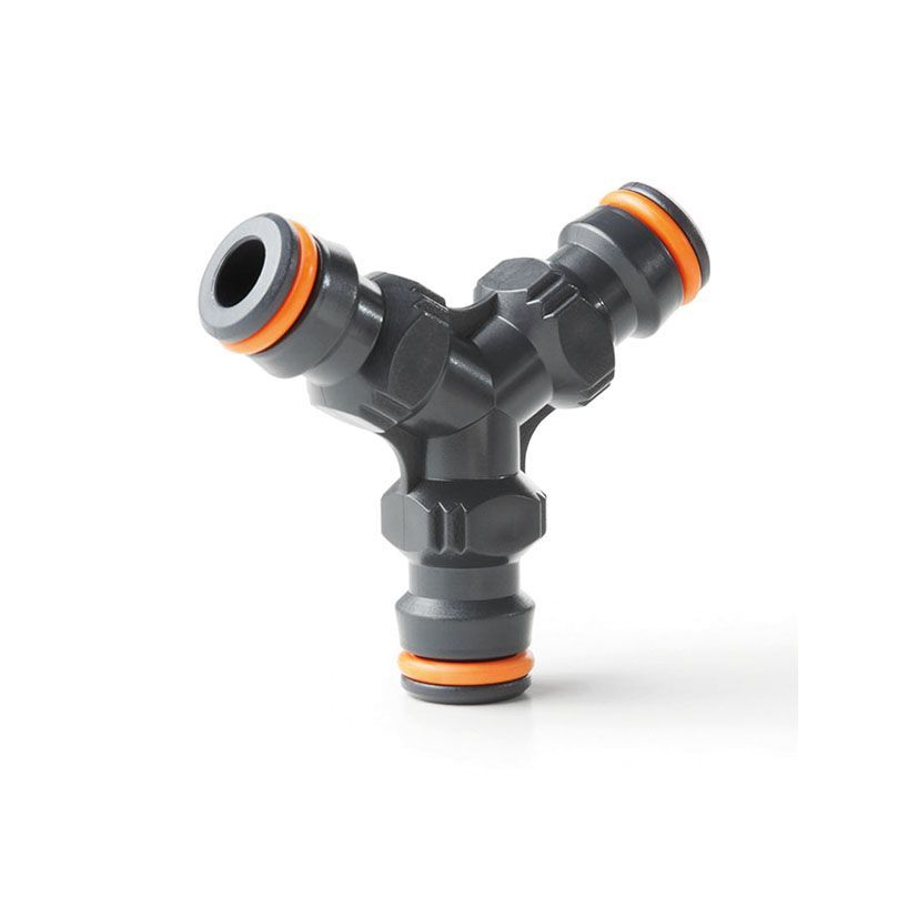 Manguito Unión Triple Lista Water Cycl, ideal para sistemas de riego en jardín. Fabricado en plástico resistente con anillos naranjas para una conexión segura de mangueras. Diseño en forma de Y para dividir el flujo de agua fácilmente. Perfecto para jardines, huertos y sistemas de riego por goteo. Fácil instalación y durabilidad garantizada.