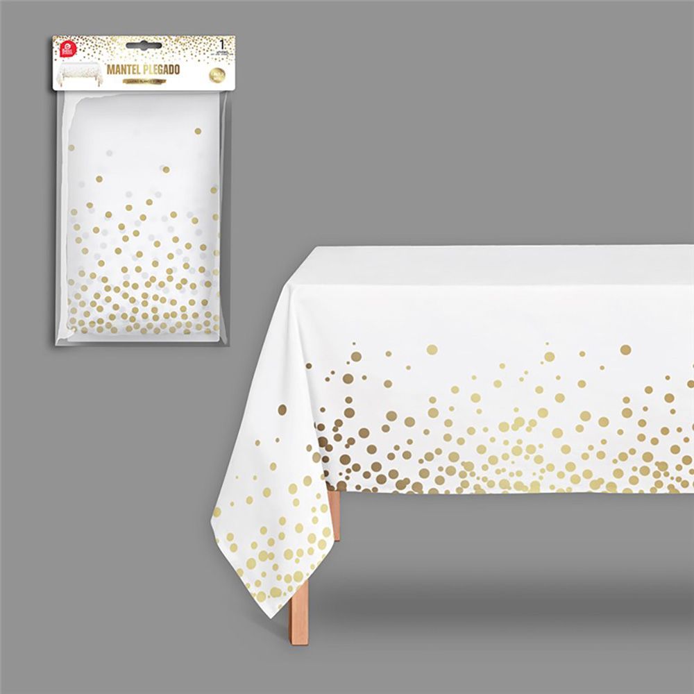Mantel blanco con estampado de lunares dorados, ideal para decorar mesas en eventos especiales, cumpleaños o celebraciones. Fabricado en poliéster de alta calidad, fácil de limpiar y resistente. Aporta un toque sofisticado y festivo a cualquier mesa. Medidas: 1,80 x 1,20 m.
