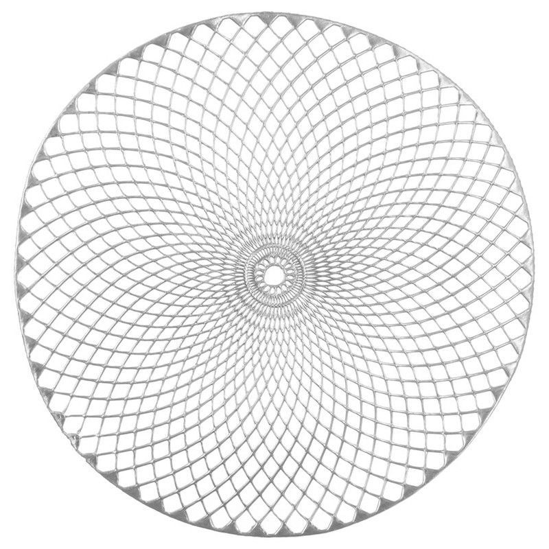 Mantel individual redondo de 38 cm en acabado plateado, con diseño geométrico de rejilla radial que aporta elegancia a cualquier mesa. Ideal para decoraciones festivas y estacionales, su acabado metálico brilla con luz natural o artificial. Perfecto para eventos especiales, comidas familiares o como toque decorativo en tu hogar.