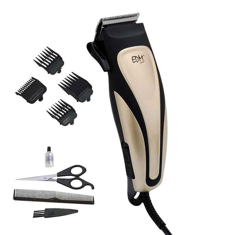 Máquina corta cabellos EDM de 10W con diseño ergonómico en negro y beige, ideal para cortes precisos en casa o peluquería. Incluye peines guía, tijeras, peine y aceite para mantenimiento. Fabricada con cuchillas de metal y cuerpo de plástico resistente. Perfecta para uso diario y fácil de limpiar.