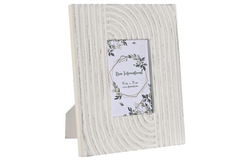Marco de fotos 10x15 cm con diseño ondulado y efecto decapé en blanco, ideal para decorar tu hogar con estilo rústico. Fabricado en madera de calidad, incluye soporte para colocarlo sobre mesas o estanterías. Perfecto para fotos de recuerdos, tarjetas o pequeños cuadros. Con detalles de hojas verdes en la etiqueta interna, aporta un toque natural y