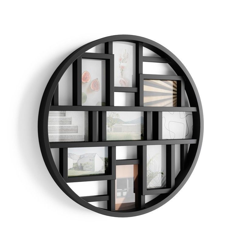 Marco de fotos redondo Luna en negro, fabricado en plástico resistente, con diseño de rejilla geométrica que combina múltiples compartimentos para fotos de distintos tamaños. Ideal para decorar paredes en salones, dormitorios o pasillos con estilo moderno y minimalista. Fácil de colgar y perfecto para mostrar recuerdos familiares o momentos especia