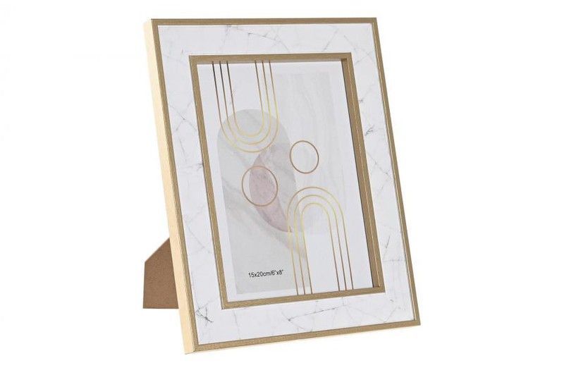 Marco foto decorativo blanco grande con cristal y acabado dorado, ideal para decorar tu hogar con estilo. Diseño elegante con fondo de mármol y detalles abstractos en tonos dorados. Fabricado en madera y cristal de calidad, incluye soporte para colocarlo sobre mesas o estanterías. Perfecto para fotos o como pieza decorativa en salón, dormitorio o o