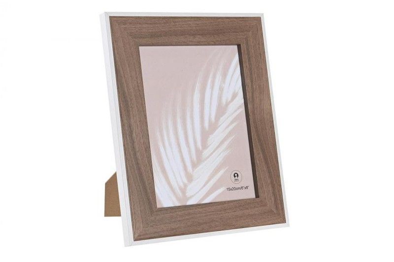 Marco foto decorativo de madera en tono marrón con borde blanco interior, ideal para exponer tus recuerdos con estilo. Fabricado con cristal transparente y soporte trasero para colocarlo sobre mesas o estanterías. Diseño minimalista y elegante, perfecto para decorar tu hogar con toques cálidos y naturales.