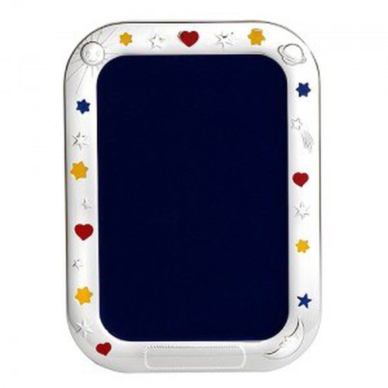 Marco fotográfico infantil Alpaca Esmaltada Firmamento Vinard 131409ES, ideal para niños. Con diseño divertido y colorido, presenta estrellas, corazones y lunas en tonos azul, rojo y amarillo sobre fondo blanco. Fabricado en plástico resistente, perfecto para decorar habitaciones infantiles o guardar recuerdos especiales. Un toque mágico para el ho