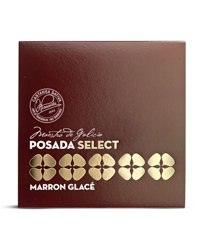 Estuche de Marrón Glacé Posada Select, un exquisito dulce gallego elaborado con castañas de alta calidad. Presentado en una elegante caja marrón con detalles dorados, ideal para regalar o disfrutar en ocasiones especiales. Su diseño sofisticado y sabor tradicional lo convierten en un producto gourmet perfecto para amantes de los dulces artesanales.