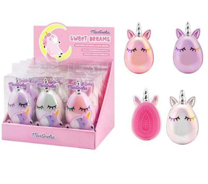 Cepillo para pelo en forma de unicornio de la marca Martinelia, ideal para niños. Con diseño divertido y color rosa iridiscente, cuenta con cerdas suaves para desenredar el cabello sin dañarlo. Hecho de plástico y metal, es fácil de usar y atractivo para pequeños amantes de los unicornios. Perfecto para rutinas de cuidado personal infantil.