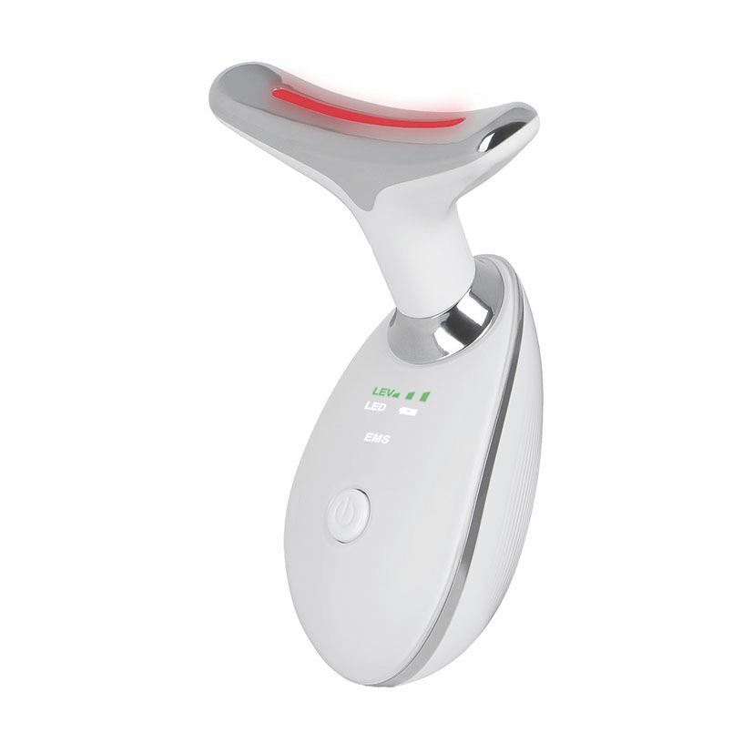 Masajeador de cuello y rostro Jocca con tecnología LED roja para relajar músculos y estimular la circulación. Diseño ergonómico en blanco y plateado, con acabado brillante y botón táctil. Ideal para adultos que buscan alivio en el cuello, hombros y rostro. Incluye indicadores luminosos para controlar el estado de funcionamiento.