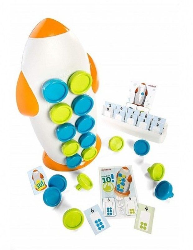Juego educativo de matemáticas manipulativas con The Rocket 10, ideal para niños en edad preescolar. Incluye un cohete de plástico con tapas coloridas y tarjetas con números y puntos para aprender conteo y operaciones básicas. Fomenta el aprendizaje activo y el desarrollo de habilidades matemáticas de forma divertida y práctica.