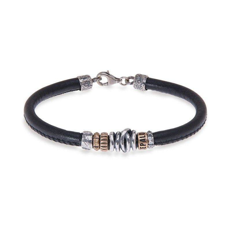 Pulsera MB154X para hombre con cuerda de cuero negro y detalles en plata de ley y tono dorado. Diseño elegante y robusto, ideal para looks casuales o formales. Cierre de mosquetón seguro y acabados metálicos con texturas variadas. Joyería de calidad para hombres que buscan estilo y durabilidad.