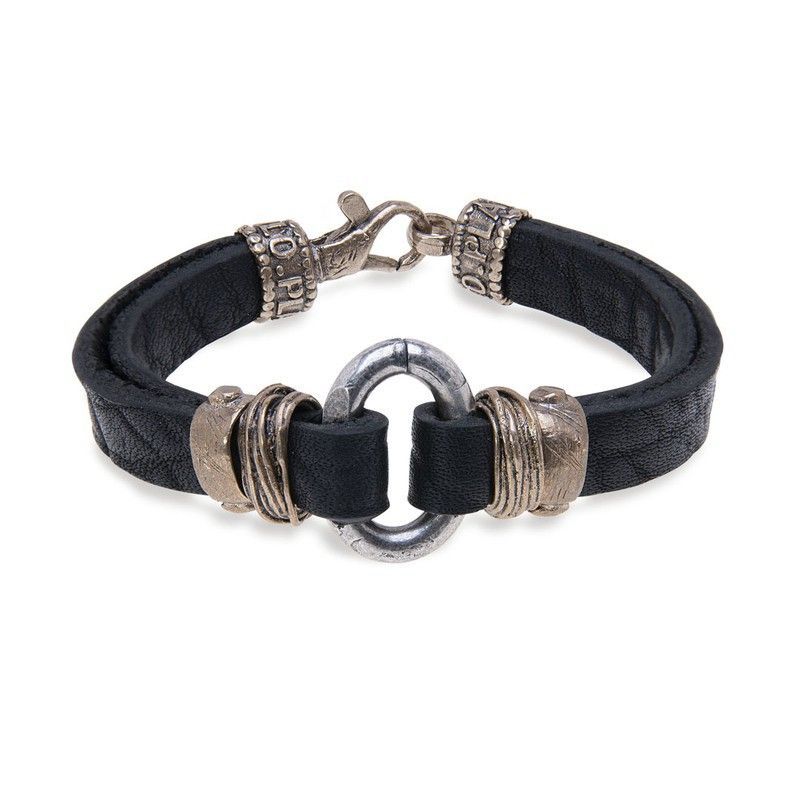Pulsera MB166X de cuero plano negro con detalles metálicos plateados, ideal para adultos que buscan un estilo urbano y sofisticado. Con cierre tipo mosquetón y anillo central decorativo, combina elegancia y resistencia. Perfecta para complementar looks casuales o semi-formales.