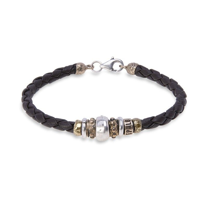 Pulsera trenzada de cuero negroCierre de mosquetón plateadoDetalles metálicos con acabados plateado y doradoPerlas decorativas con texturas variadas