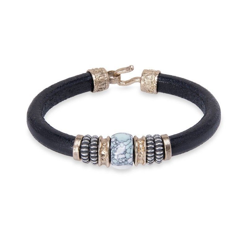 Pulsera MB185X modelo Ikom para hombre, con banda de cuero negro y cierre de gancho metálico. Destaca por su pieza central de resina con efecto mármol azul claro, rodeada de cuentas metálicas con textura ondulada. Ideal para looks casuales o urbanos, combina elegancia y estilo masculino. Hecha con materiales de calidad para un uso diario duradero.