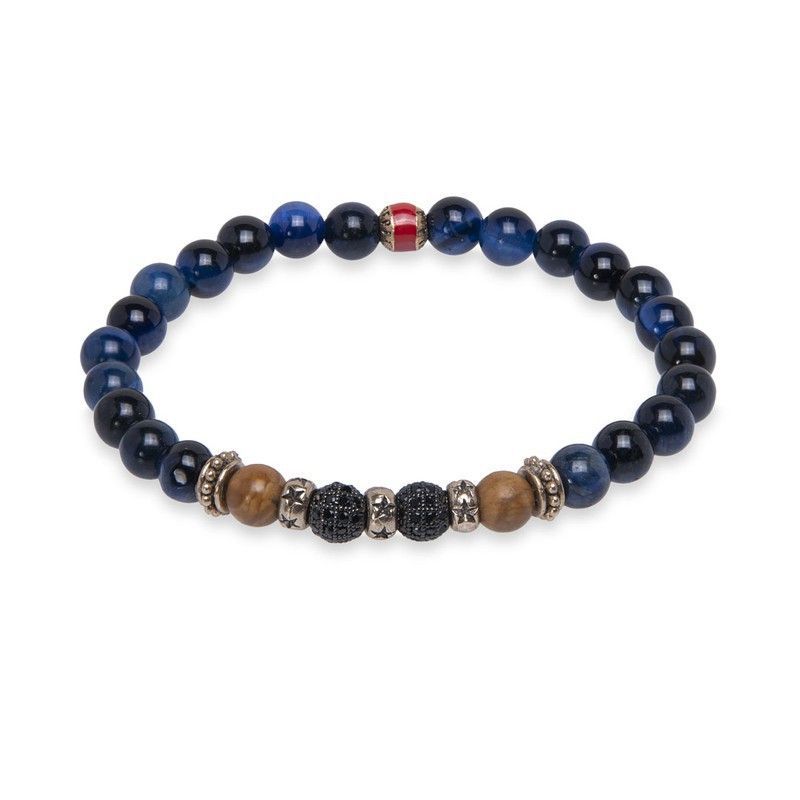 Pulsera MB196X para hombre con diseño elegante y moderno, fabricada con bolas de plata de palo azul, madera marrón y detalles metálicos plateados. Incluye dos bolas centrales con pavé de circonitas y una bola roja como acento. Ideal para quienes buscan un accesorio sofisticado y versátil para diario o ocasiones especiales. Elástica y cómoda, perfec