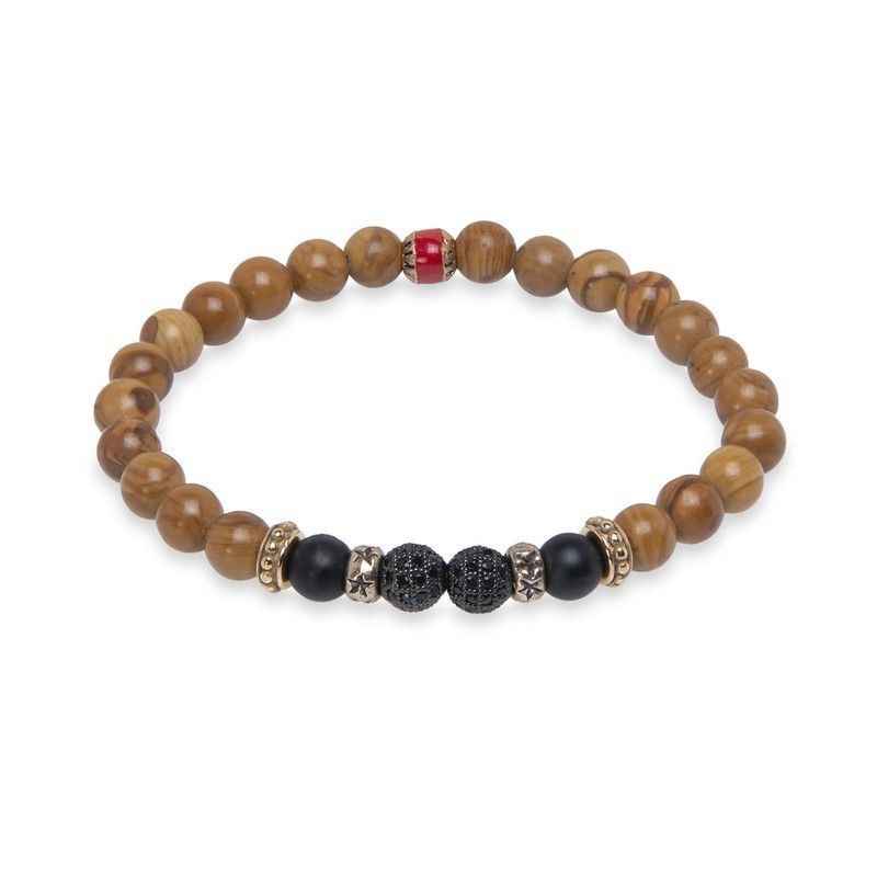 Pulsera MB202X de plata de palo modelo Dron, con cuentas de madera natural y detalles metálicos en dorado y plateado. Incluye cuentas negras texturizadas y un acento rojo brillante. Diseño elegante y robusto, ideal para hombres que buscan un accesorio versátil y con estilo. Perfecta para uso diario o ocasiones especiales.