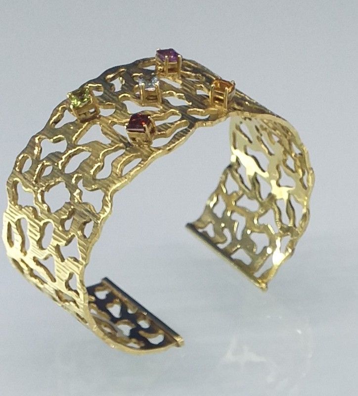 Pulsera esclava MC007 en oro con diseño de encaje metálico y piedras de colores. Ideal para mujeres que buscan un toque sofisticado y único. Hecha en metal de alta calidad con acabado brillante y textura artesanal. Perfecta para ocasiones especiales o como complemento elegante en tu día a día.
