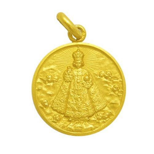 Medalla de oro 18kts con imagen del Niño Jesús de Praga, ideal para amantes de la religión y la joyería fina. Con acabado brillante y detalles en relieve, incluye anilla para cadena. Perfecta como regalo o para llevar como amuleto de protección y fe. Diámetro de 20mm.