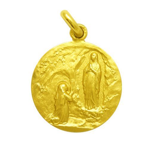 Medalla circular de 22mm con relieve de nuestra señora de lourdes y una figura arrodillada, acabado brillante en oro 18kt