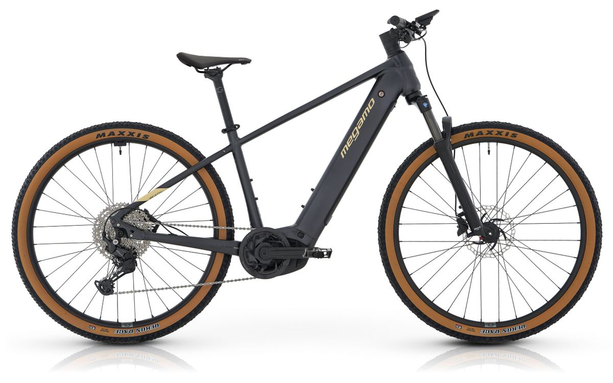 Bicicleta eléctrica de montaña con cuadro negro mateRuedas con llantas de color marrón y neumáticos maxxisSistema de transmisión por cadena con cambio traseroFrenos de disco hidráulicosMotor central integrado en el cuadroManillar ergonómico con gatillos de freno y control de asistenciaSillin deportivo negroLogotipo 'megamo' en el tubo diagonal