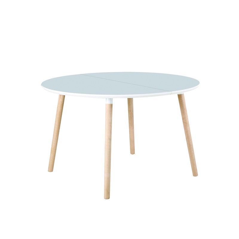 Mesa redonda con superficie blanca y patas de madera naturalDiseño extensible con bisagras visibles en el centroPatas inclinadas hacia afueraEstructura ligera y moderna