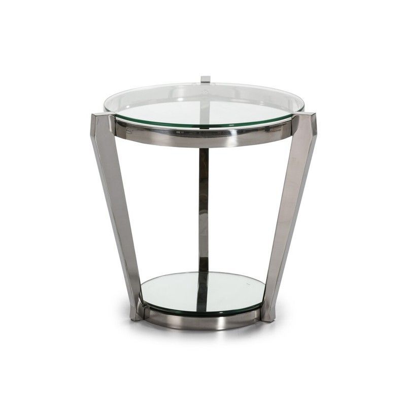 Mesa de centro redonda de acero inoxidable plateado con dos niveles de cristal transparente. Diseño moderno y elegante, ideal para salones o espacios contemporáneos. Estructura metálica con acabado pulido y base inferior circular. Combina funcionalidad y estilo en un mueble versátil para tu hogar.