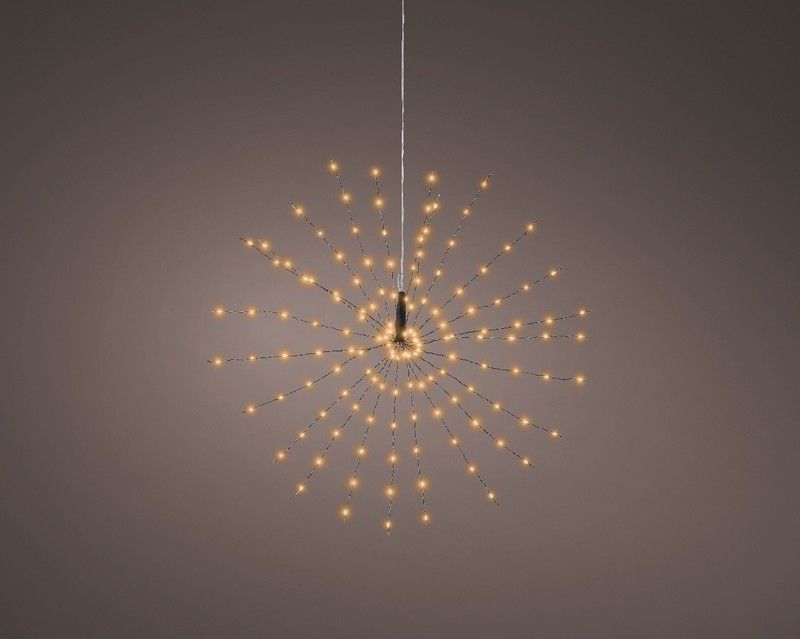 Lámpara colgante MICRO LED POLESTAR con efecto centelleo, ideal para decorar espacios interiores o exteriores. Diseño estrella con luces cálidas y 8 funciones de iluminación. Fabricada en metal y plástico, perfecta para crear ambientes mágicos en jardines, terrazas o salones. Diámetro 55 cm, fácil instalación y uso seguro al aire libre.
