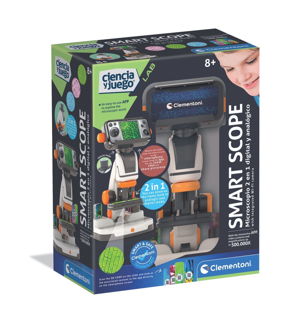 Microscopio digital con Wi-Fi SMART SCOPE de Clementoni, ideal para niños a partir de 8 años. Combina modo digital y analógico con aumento hasta 500x. Incluye app móvil para explorar el mundo microscópico. Diseño moderno en blanco, naranja y gris. Perfecto para despertar la curiosidad científica en casa o en clase.