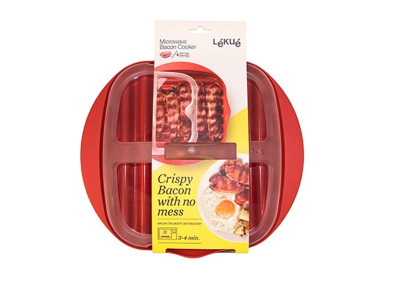 Prepara bacon crujiente sin complicaciones con este accesorio de microondas Lekue rojo.