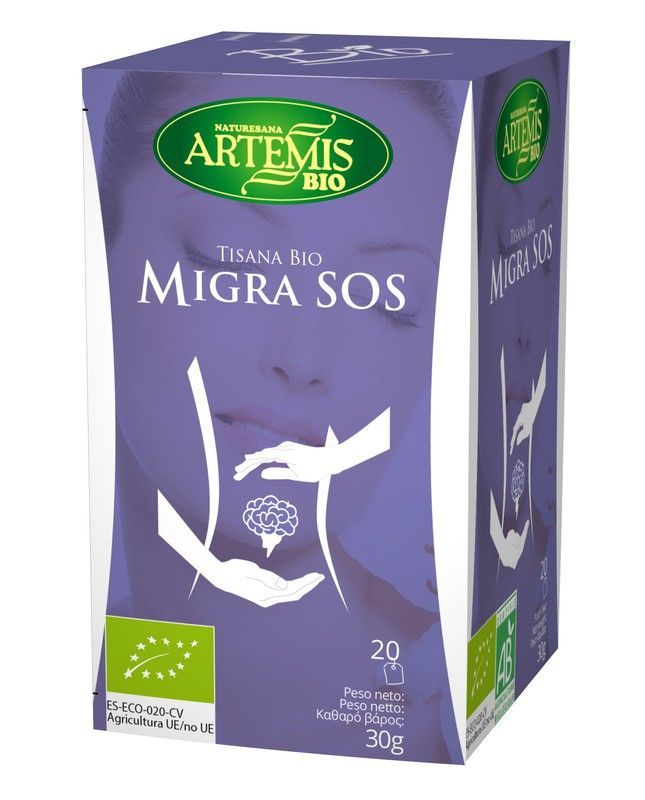 Tisana bio Migrasos de Artemis Bio, en caja de 20 filtros. Ideal para aliviar molestias relacionadas con la migraña, elaborada con ingredientes naturales y certificación ecológica. Perfecta para consumir en casa o llevar en viajes. Contenido neto: 30g.