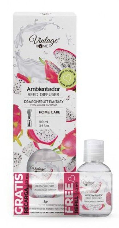 Ambientador Mikado Vintage con aroma a fruta de dragón, ideal para perfumar tu hogar con un toque exótico y fresco. Incluye difusor de 100 ml y recarga gratuita de 50 ml. Embalaje elegante con diseño de frutas tropicales y salpicaduras blancas. Perfecto para espacios como salón, dormitorio o baño. Fragancia duradera y natural, con un toque sofistic