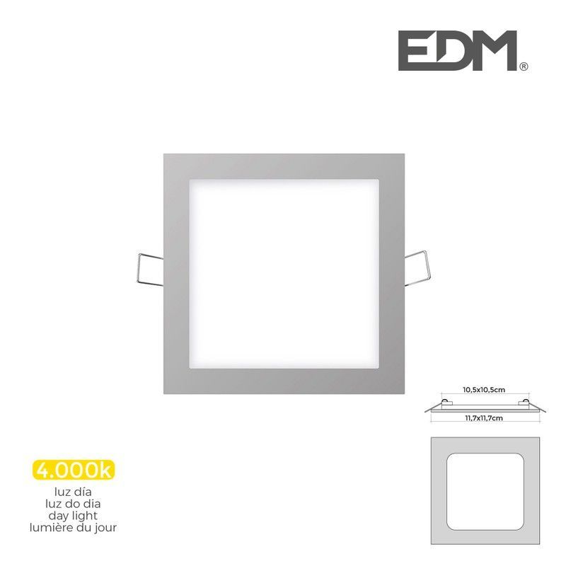 Downlight LED cuadrado EDM de 6W y 320 lúmenes, con luz blanca fría de 4.000K ideal para iluminación diurna. Diseño moderno con marco cromado y acabado plateado, perfecto para empotrar en techos. Ideal para salones, cocinas o baños. Alta eficiencia energética y durabilidad.