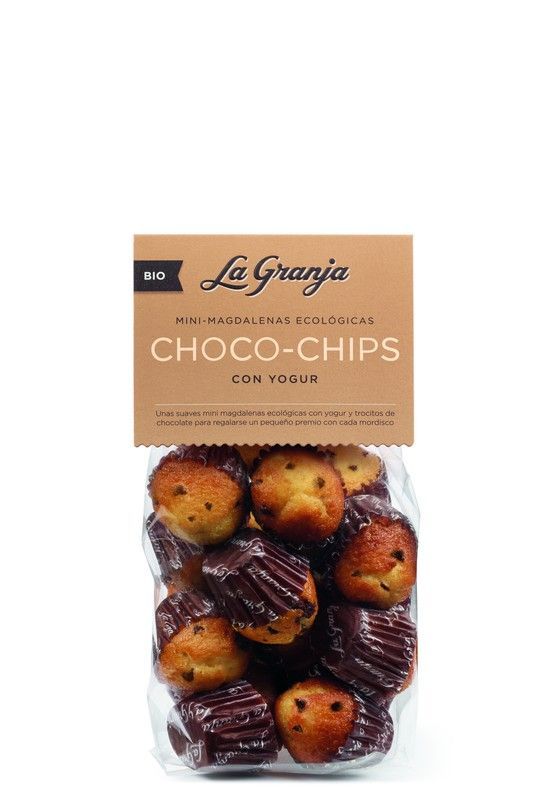 Mini magdalenas ecológicas de La Granja con choco-chips y yogur, ideales para un tentempié saludable y delicioso. Con trocitos de chocolate y textura suave, son perfectas para disfrutar en cualquier momento del día. Producto orgánico y sin aditivos, en envase transparente que muestra su apetecible aspecto. Ideal para amantes de los dulces naturales