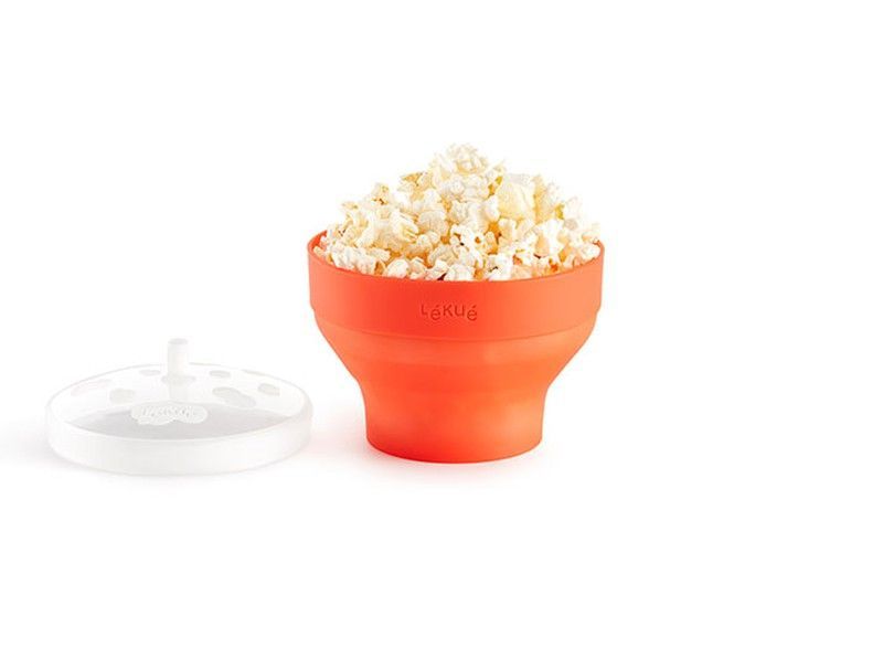 Mini pop corn Lékué para microondas en silicona naranja, ideal para preparar palomitas caseras sin aceite ni grasa. Incluye tapa con válvula para una cocción segura y uniforme. Fácil de usar, limpiar y almacenar. Perfecto para disfrutar de una merienda saludable y deliciosa en casa o en el cine en casa.