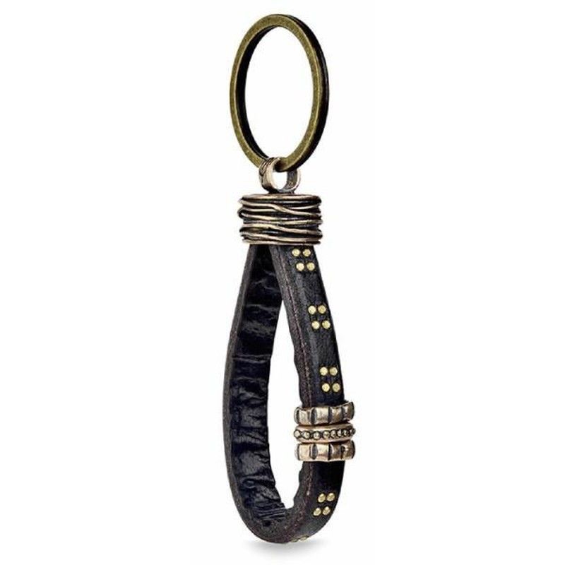 Llavero MK4C en cuero negro con acabado texturizado y detalles metálicos en plateado y bronce. Diseño elegante y robusto con remaches dorados y anillo de metal. Ideal para adultos que buscan un accesorio sofisticado y duradero para sus llaves. Combina estilo vintage con funcionalidad diaria.