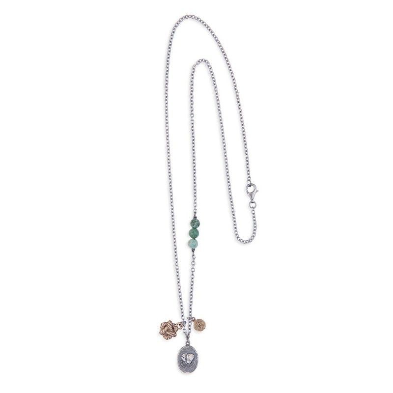 Collar MN001X de plata de palo con piedras africanas, ideal para adultos que buscan un toque bohemio y elegante. Fabricado con cadena de acero inoxidable y detalles en piedra natural verde y gris, con colgantes en forma de hojas. Perfecto para combinar con looks casuales o semi-formales, añadiendo un estilo único y sofisticado a tu atuendo diario.