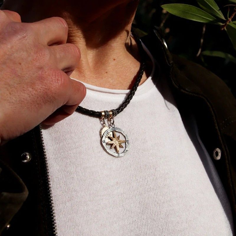 Collar MN023X con cuerda trenzada de cuero negro y colgante circular en plata 925 y bronce con diseño de estrella. Ideal para adultos que buscan un accesorio versátil, elegante y con toque distintivo. Perfecto para combinar con looks casuales o urbanos. Calidad premium, acabados duraderos y diseño atemporal.