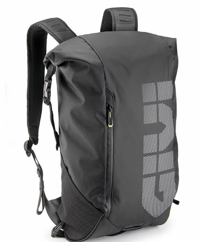 Mochila GIVI EA148B de 20 L con cierre Roll Top, ideal para motociclistas y viajeros. Fabricada en poliéster resistente, ofrece gran capacidad y comodidad. Diseño ergonómico con correas acolchadas y bolsillo lateral con cremallera. Logo GIVI en tono gris con detalles en amarillo. Perfecta para uso diario o viajes en moto.