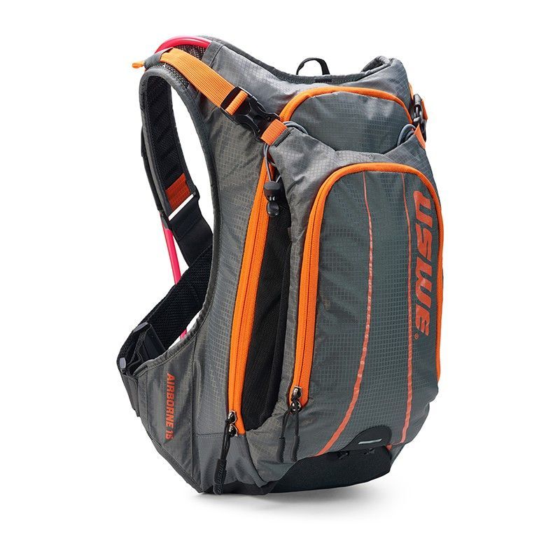 Mochila de hidratación USWE Airborne 15 en gris y naranja, ideal para ciclistas y deportistas al aire libre. Fabricada en poliéster resistente, cuenta con múltiples compartimentos, correas ajustables y sistema de hidratación integrado. Diseño ergonómico para mayor comodidad durante largas jornadas de entrenamiento o aventuras en montaña.