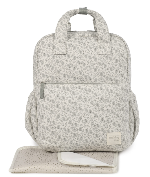 Mochila con asas superiores y correas de hombroBolsillo frontal con cremalleraEtiqueta con marca 'walking mum'Diseño floral sutil en tonos grises y blancosIncluye cambiador plegable con estampado de lunares y bolsillo interior blanco