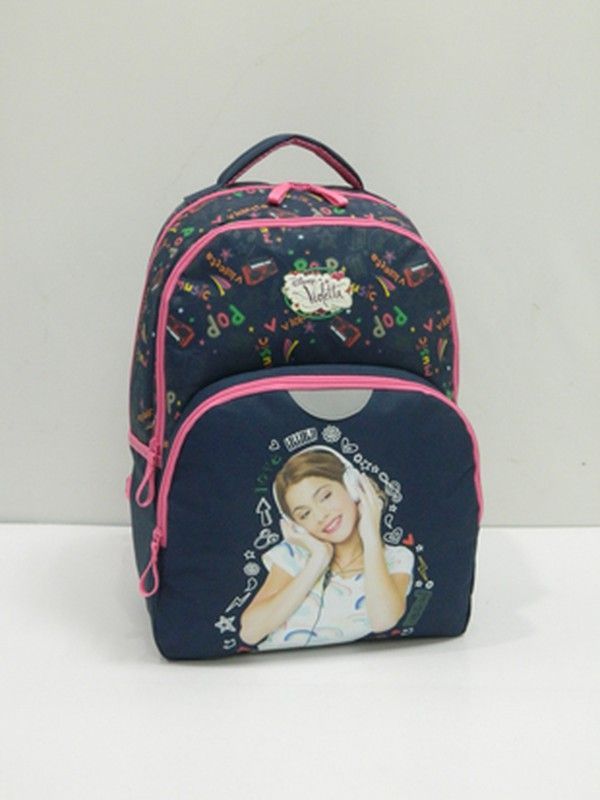Mochila infantil Violeta de 31x16 cm, ideal para niños y niñas. Con diseño divertido de niña con auriculares y estampado colorido, detalles en rosa y borde brillante. Fabricada en poliéster resistente, perfecta para el colegio o actividades diarias. Incluye compartimento frontal con imagen circular y etiqueta personalizada. ¡Un accesorio práctico y