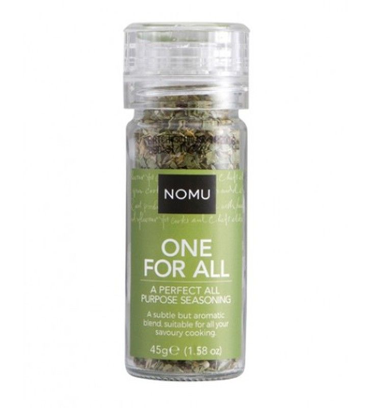Molinillo de especias NOMU 'One for All', una mezcla aromática y versátil ideal para toda clase de cocina salada. Con 45g de hierbas secas seleccionadas, este condimento todo en uno aporta sabor suave pero intenso a tus platos. Perfecto para cocinar en casa, fácil de usar gracias a su tapa molinillo. Ideal para amantes de la gastronomía casera y sa
