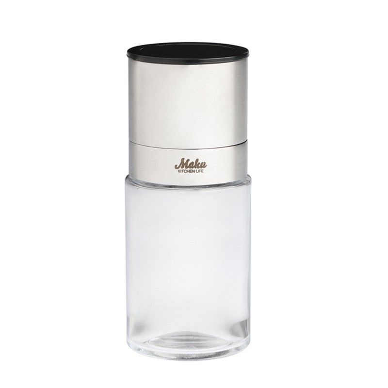 Molinillo regulable para especias de diseño elegante con cuerpo transparente y tapa metálica, ideal para tu cocina.
