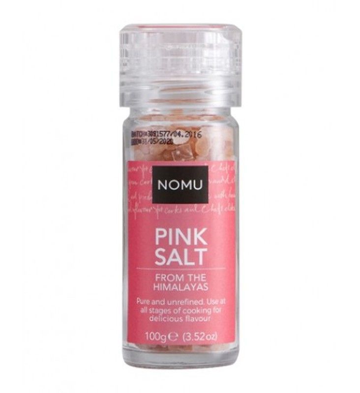 Molinillo de sal rosa del Himalaya NOMU, en frasco de vidrio transparente con tapa de plástico. Sal pura y no refinada, ideal para añadir sabor a tus platos en cualquier etapa de cocción. Perfecta para cocineros que buscan ingredientes naturales y de alta calidad. Peso neto: 100g.