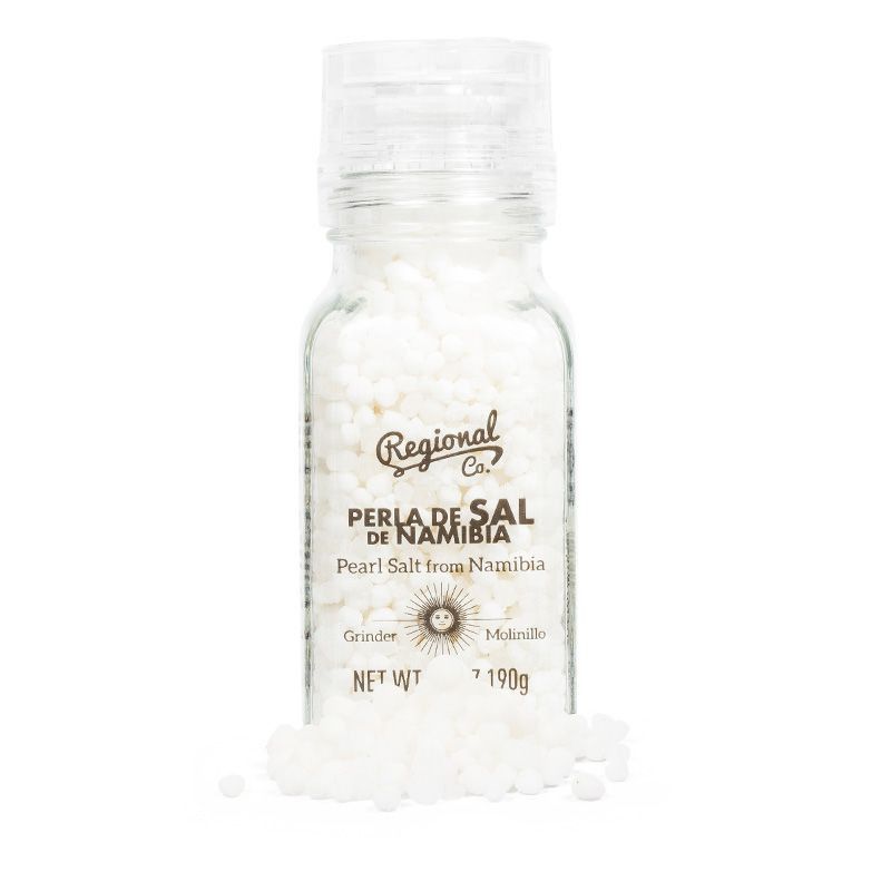 Molinillo de sal perla de Namibia de Regional Co., en frasco de vidrio transparente con tapa de plástico. Sal gourmet en forma de perlas blancas, ideal para realzar el sabor de carnes, pescados y ensaladas. Peso neto 190g. Perfecta para cocineros que buscan calidad y presentación en la mesa.