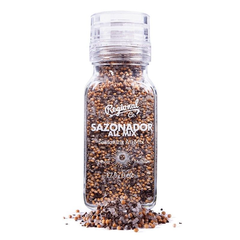Molinillo Sazonador para Todo de Regional Co., mezcla de especias en grano ideal para condimentar carnes, verduras y guisos. Con 17.5 g de mezcla de granos aromáticos, perfecto para cocinar con sabor auténtico. Frasco de vidrio con tapa de plástico para fácil uso y conservación. Ideal para amantes de la cocina casera y sabores naturales.