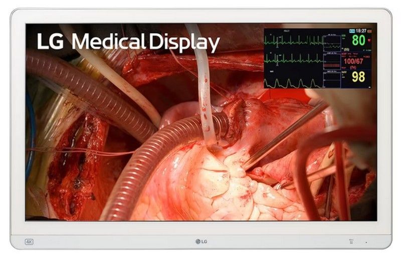 Monitor quirúrgico LG de 27 pulgadas con resolución 8Mpx, ideal para entornos médicos exigentes. Diseño profesional con marco blanco y pantalla de alta definición que muestra imágenes quirúrgicas con precisión. Incluye panel de monitorización médica en tiempo real. Fabricado con materiales resistentes como plástico y acero inoxidable para uso en sa