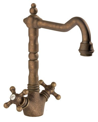 Grifo monobloc con caño curvo y tubo largoManetas cruzadas de diseño clásicoAcabado en bronce antiguo con textura envejecidaCierre cerámicoBase robusta con detalles decorativos