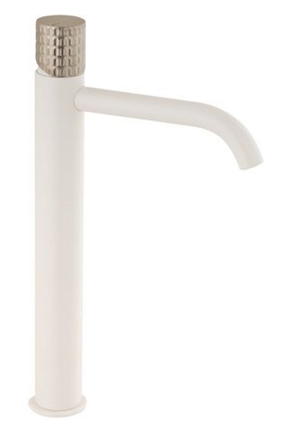 Grifo monomando alto de 33 cm para lavabo, con diseño moderno y elegante. Cuerpo blanco mate y maneta plateada con textura cuadrada para un agarre cómodo. Fabricado con acero inoxidable y plástico de alta calidad, incluye cartucho cerámico para un funcionamiento suave y duradero. Ideal para baños contemporáneos que buscan estilo y funcionalidad.