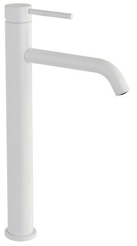 Grifo monomando de diseño alto para lavabo, con cuerpo cilíndrico y mango horizontal, boquilla curva y acabado mate blanco, altura aproximada de 29 cm, cartucho cerámico interno